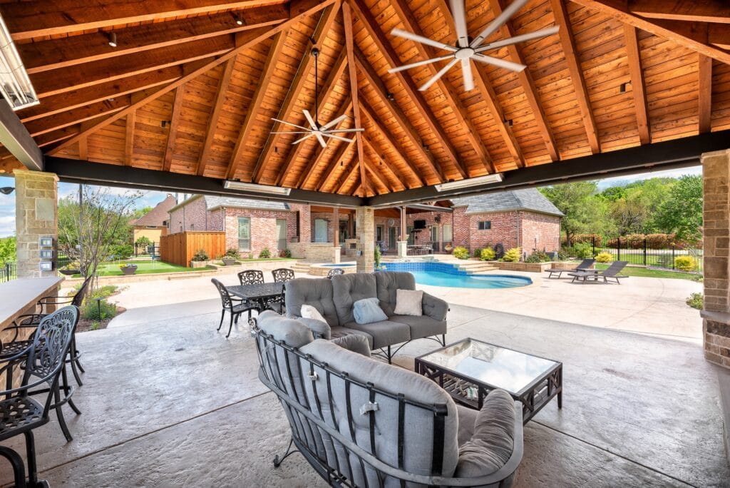 A patio cover features a solid roof structure engineered for full protection from sun and rain. In high-end outdoor living design, patio covers often anchor outdoor kitchens, dining areas, integrated lighting, ceiling fans, and mounted televisions. The result is a cohesive outdoor room that feels intentional, finished, and usable across the seasons.