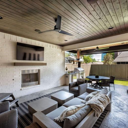 We extended the patio and selected materials that complemented the house’s contemporary design and maximized the space’s functionality. Key elements include a custom DCS grill station, refrigerator, retractable Universal Electric Screens, and new flooring. These additions turned the once-limited patio into a fully functional outdoor living space that felt much larger than its dimensions.