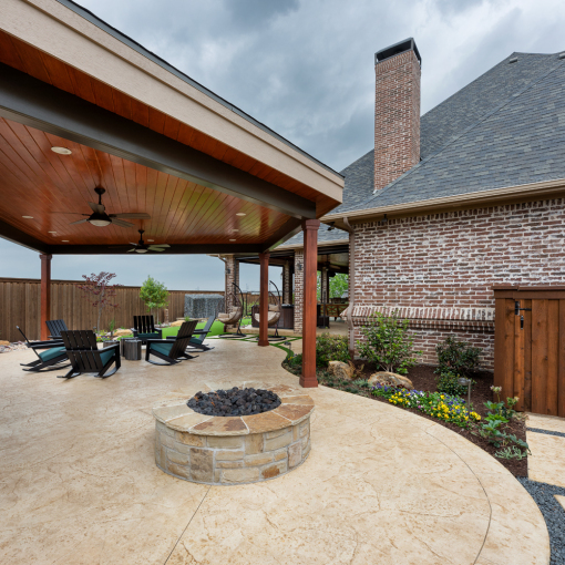 - Patterned finished concrete patio for a stylish and durable foundation.