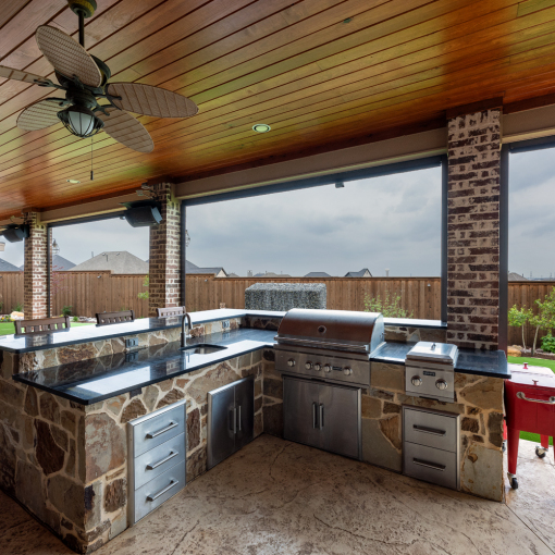 - Fully equipped outdoor kitchen with a built-in grill station, sink, granite countertops, and wraparound seating.