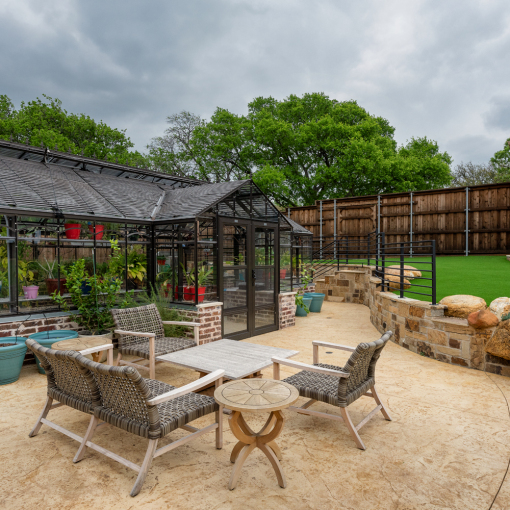 The primary challenge was managing the elevation changes between the greenhouse, patio, and yard while maintaining smooth accessibility. To address this, custom retaining walls, stairs, and terracing were carefully implemented, creating level transitions that blend seamlessly with the landscape. Safety and visual continuity were key concerns, leading to the addition of custom iron railings along elevated areas, offering both protection and aesthetic appeal. The greenhouse required optimal sun exposure, which was preserved by precise placement, while the patio was designed to provide a shaded, comfortable environment without obstructing natural light.