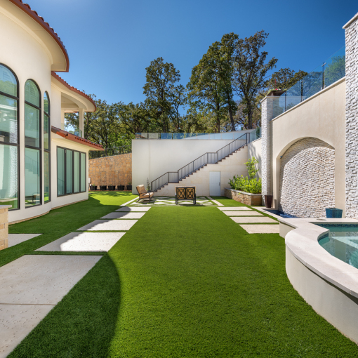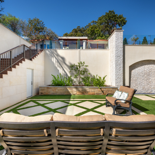 Creating a cohesive and functional multi-level design required innovative solutions and attention to detail. The integration of a professional putting green with the existing artificial turf demanded a carefully planned landscaping and drainage system. Repurposing existing pavers at the base of the steps and repairing gravel and mulch beds posed additional challenges, which were skillfully addressed to maintain the space’s seamless and polished aesthetic. Balancing these features across multiple levels while maintaining the resort-style appeal was a critical focus throughout the project.Final Outcome
