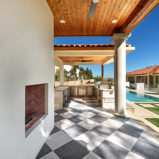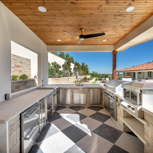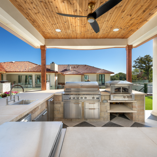 - Arbor and Grilling Station: A watertight arbor with exposed cedar beams creates an elegant shaded retreat, while the custom-built grilling station takes outdoor cooking to the next level. Featuring a high-end grill and a built-in pizza oven, this area serves as the centerpiece for culinary and social gatherings.