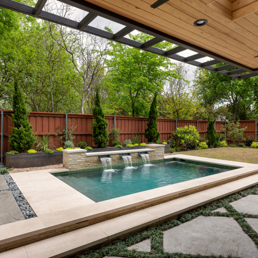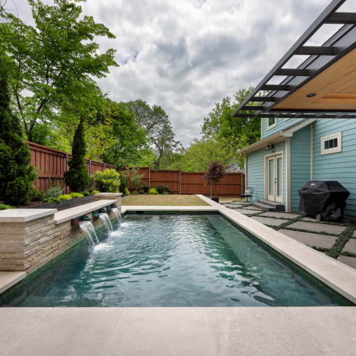 The completed project elevates the outdoor living experience, offering a well-integrated and visually striking space that reflects modern design principles. A horizontal cedar fence provides discreet screening, while custom metal railings add a sleek architectural element. The poolside environment is enhanced with carefully curated landscaping, including Mexican beach pebbles, raw metal planters, and precision-cut metal edging, creating a harmonious connection between hardscape and softscape. Functional storage solutions, such as a watertight woodshed with built-in shelving, further enhance usability. The result is a thoughtfully designed and expertly executed outdoor space that not only enhances the property’s curb appeal but also provides lasting comfort and convenience.