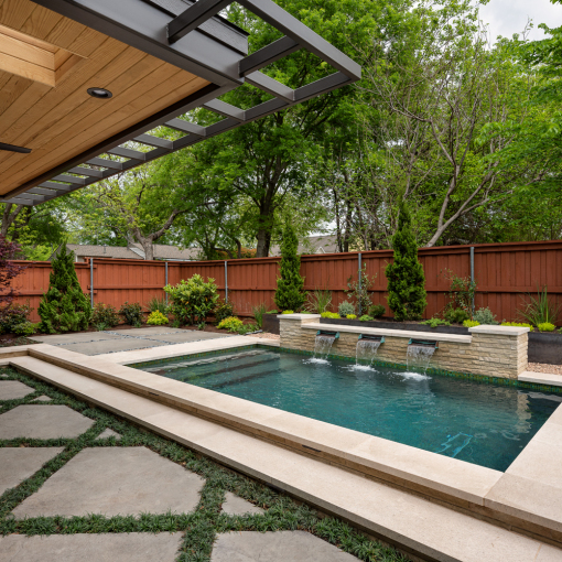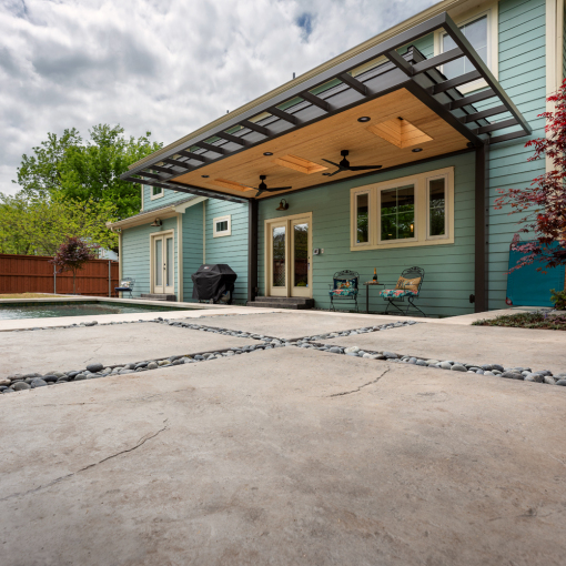 A refined poolside retreat seamlessly blends modern aesthetics with functionality, transforming the front and side yards into a sophisticated outdoor living space. The design integrates patterned concrete surfaces, sleek cedar fencing, and custom metal elements to enhance privacy, durability, and visual appeal. Carefully planned drainage and landscaping ensure long-term sustainability while complementing the home’s contemporary style. This project showcases expert craftsmanship and innovative solutions, delivering a space designed for relaxation, entertaining, and effortless outdoor living.