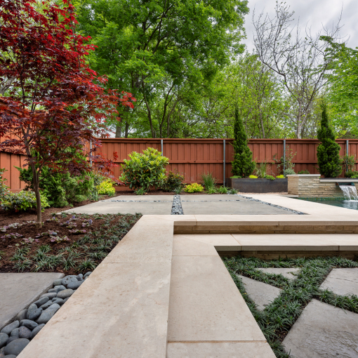 - Floating concrete pads and brick rowlock edges, designed for a clean, contemporary look.