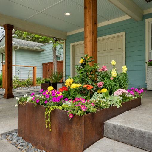 - Mexican beach pebbles, raw metal planters, and metal edging, contributing to a polished and cohesive landscape design.