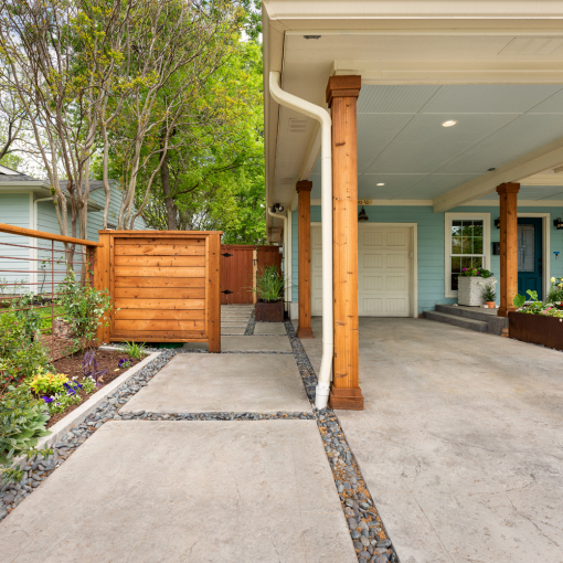 - Patterned concrete driveway and front porch, adding visual interest, durability, and structure.