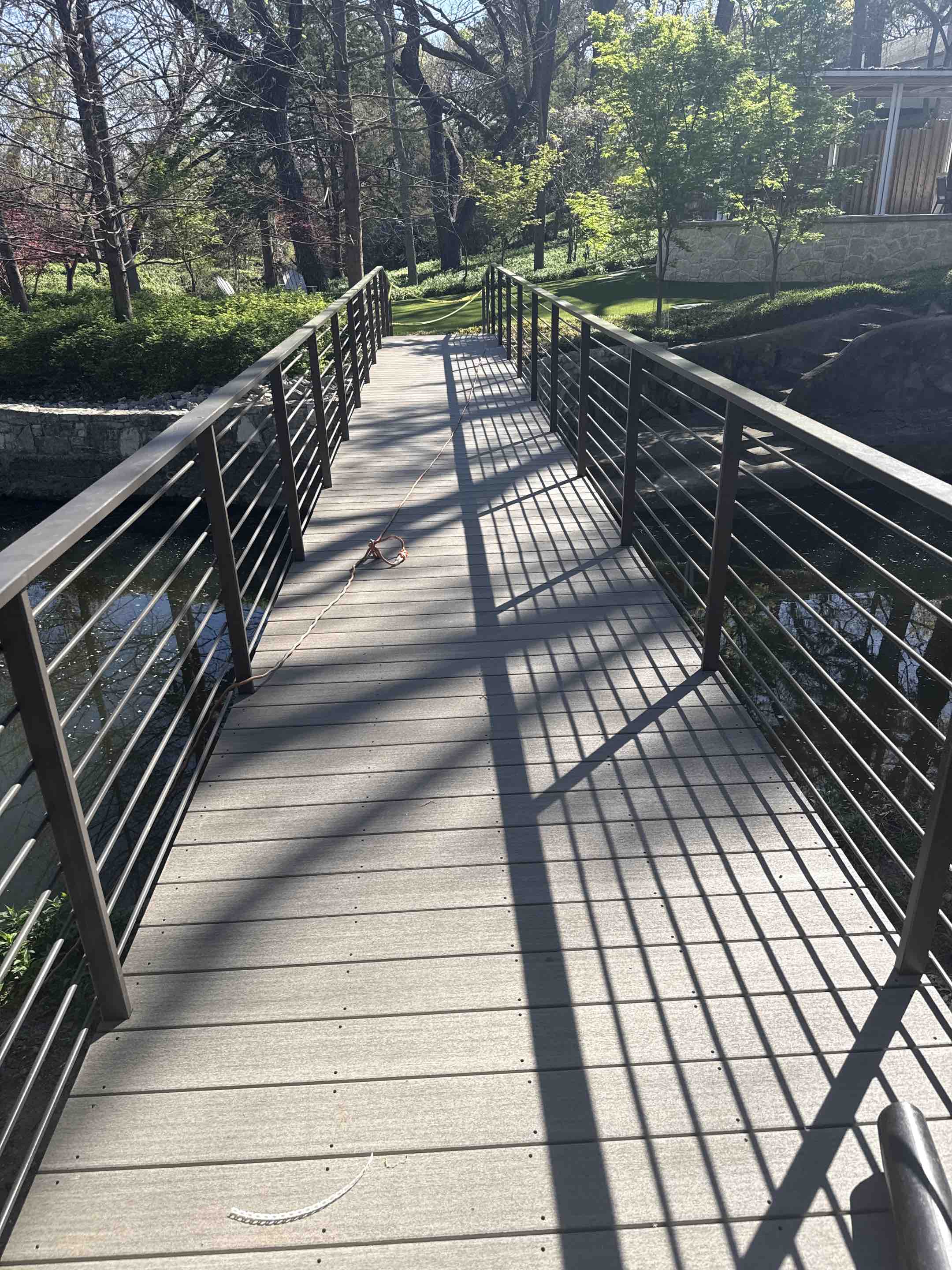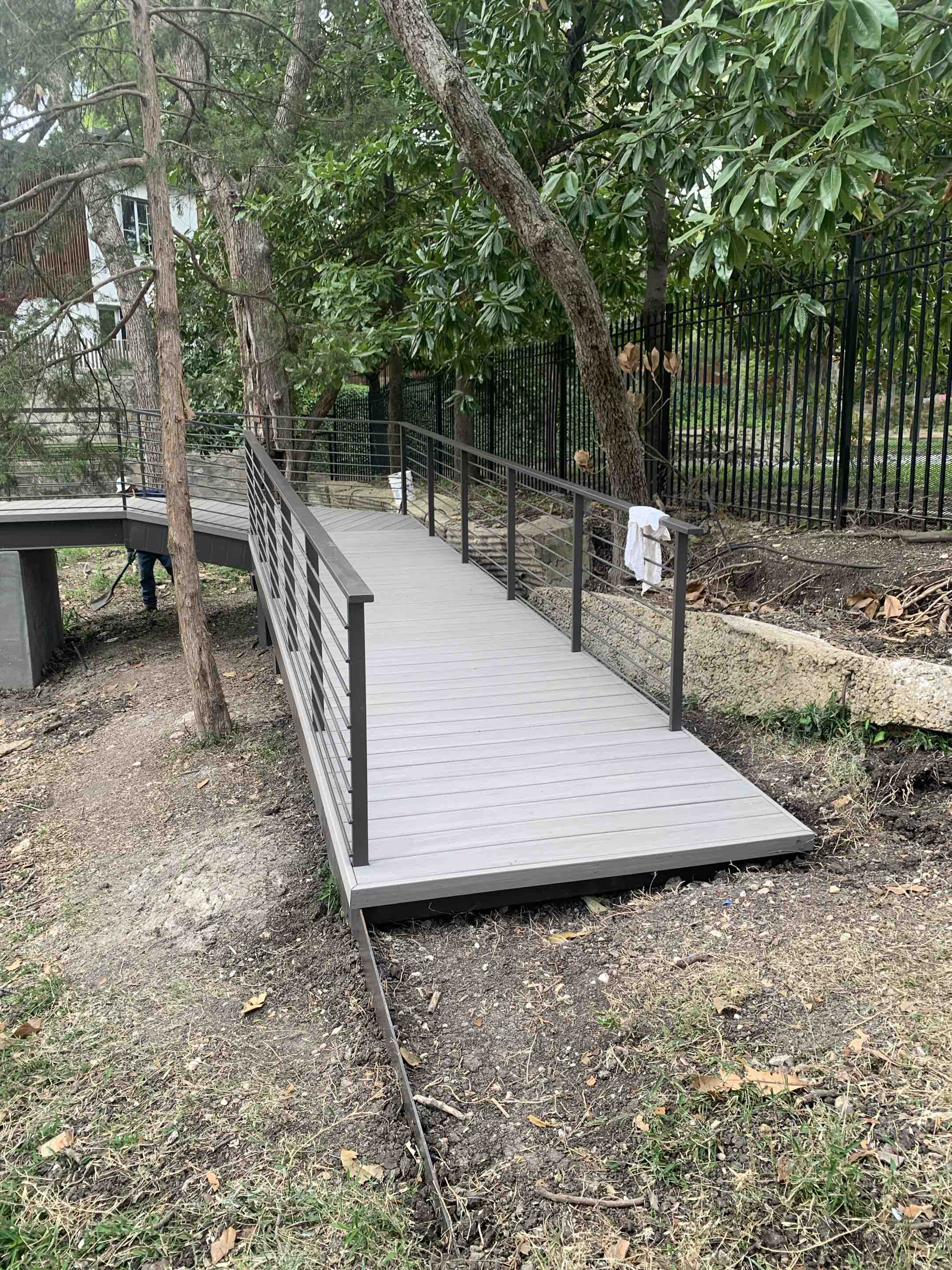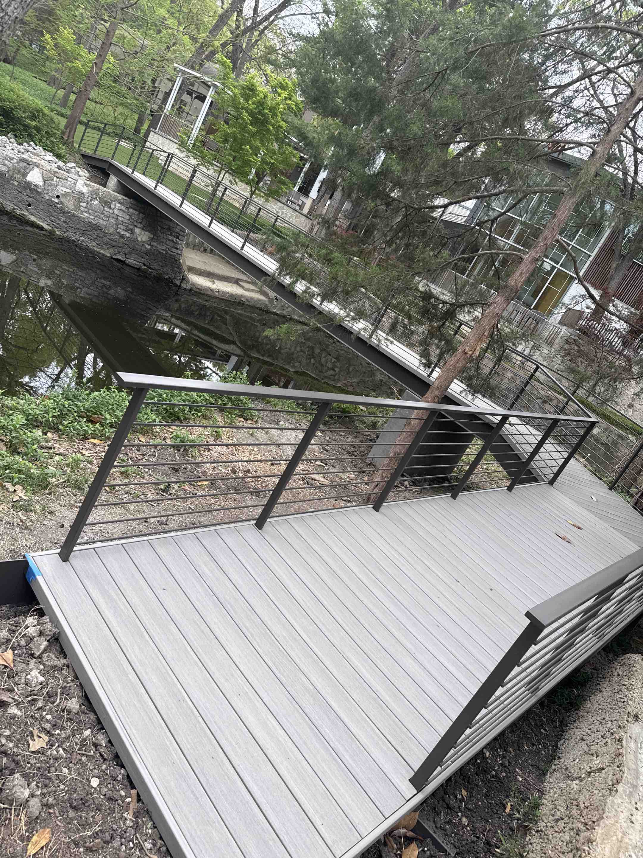 New metal frame structure bridge with azek decking going up, custom railings and 29ft deep concrete piers it’s getting close to be done