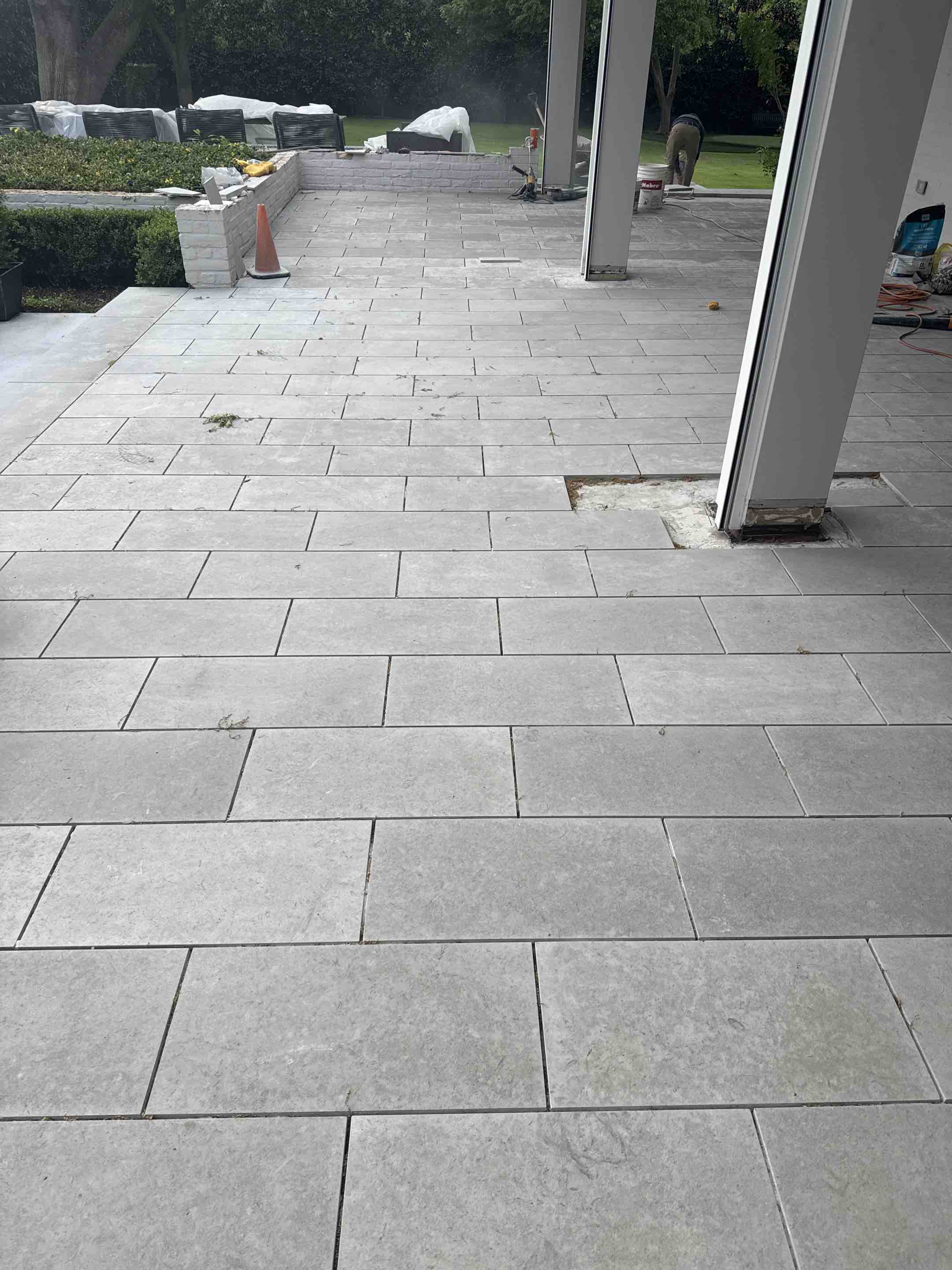 Final touches on custom iron fence electric gates, brick columns, call boxes, lanterns stone patio
