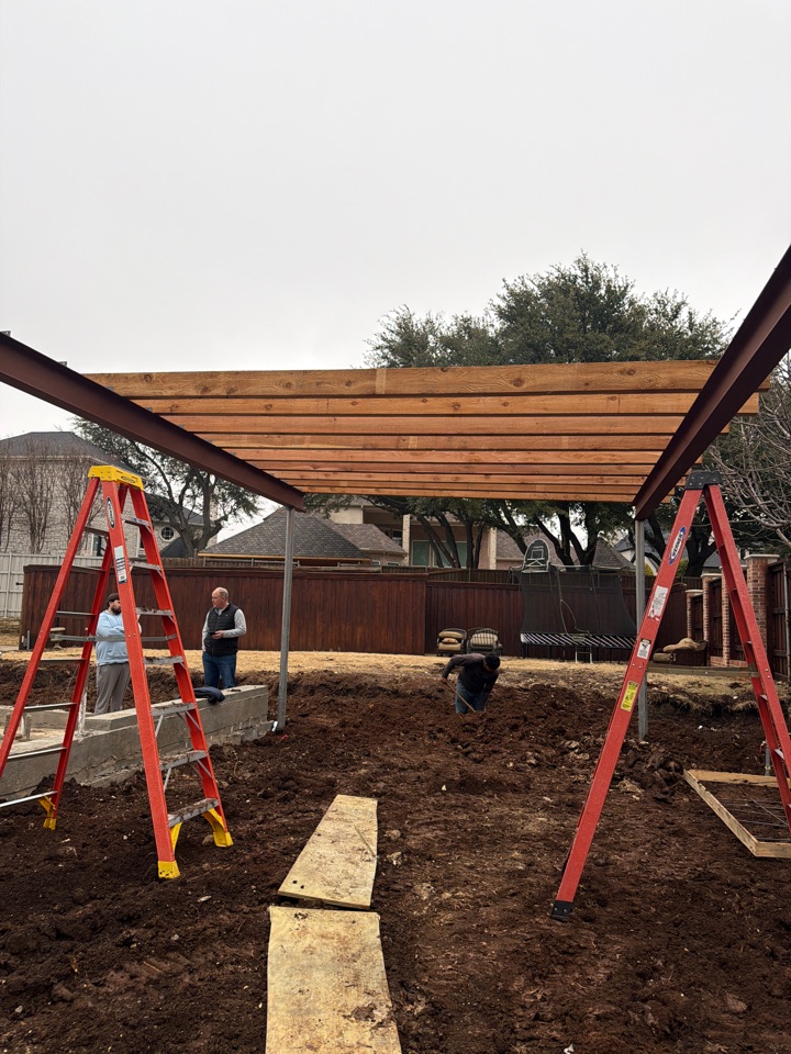 Pre-construction: Backyard renovation with new metal and cedar structure over outdoor patio area.